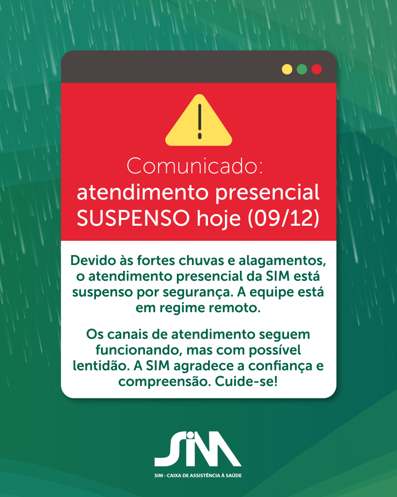 A SIM – Caixa de Assistência à Saúde informa que, o atendimento presencial está suspenso nesta terça-feira (09/12) devido às fortes chuvas e alagamentos na Grande Florianópolis. A medida tem como objetivo preservar a segurança de colaboradores e beneficiários.